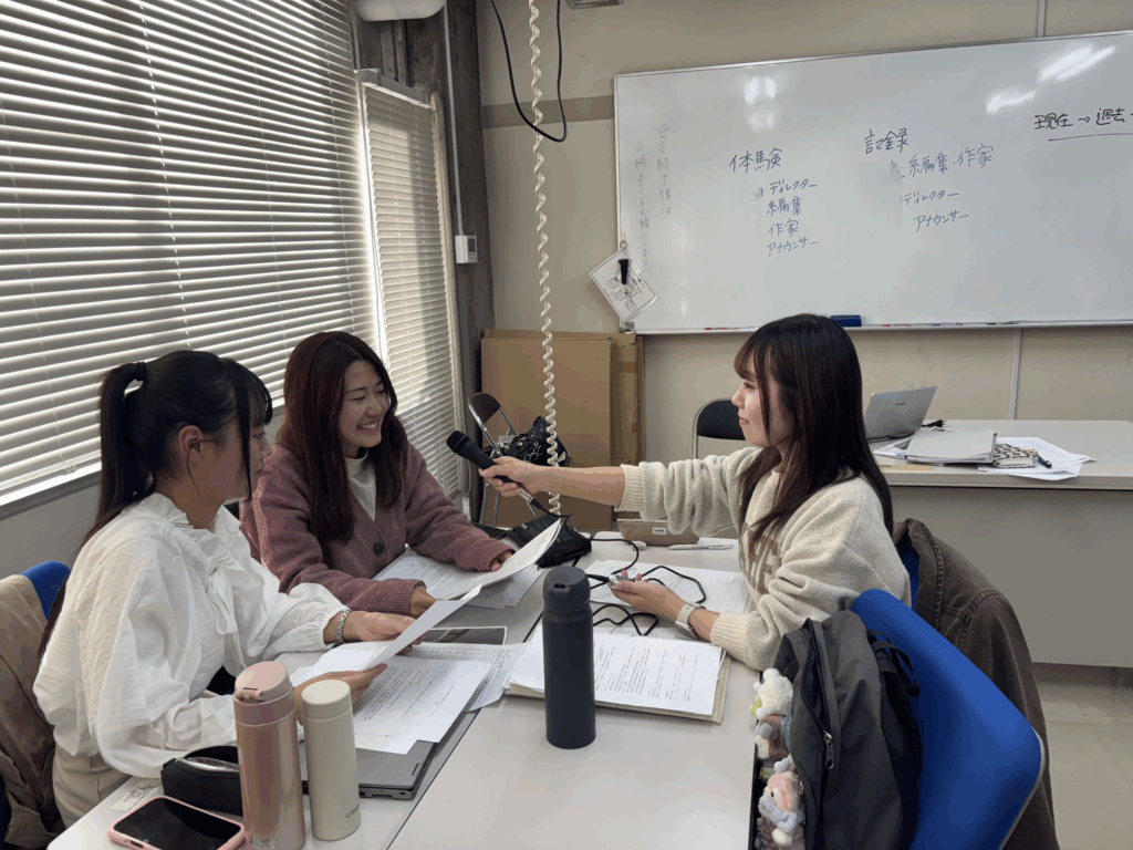 私の班では、まず昨年度の先輩方が制作したラジオ番組の進行表を参考にしながら、番組の流れについて話し合い、インタビュー先の候補を決定しました。こちらも意外とスムーズに決まり、続いて質問事項の検討に入りました。本題にいきなり入ると唐突すぎるため、導入となる“ワンクッション”の質問を考えるのが難しく、工夫が必要だと感じました。